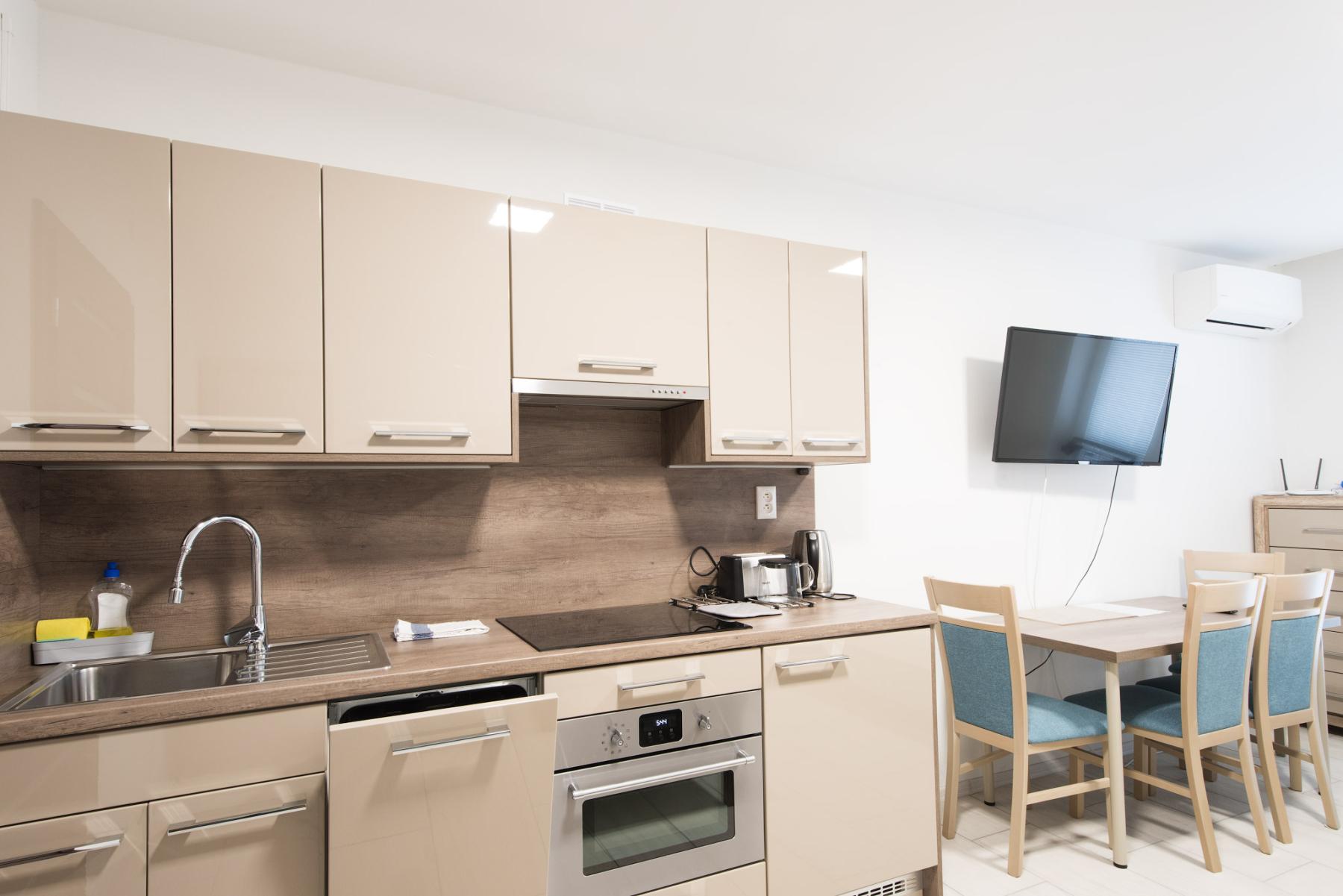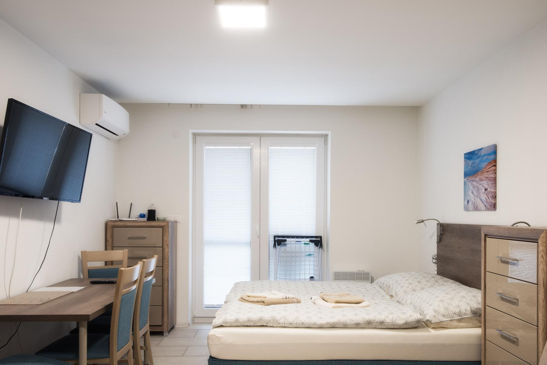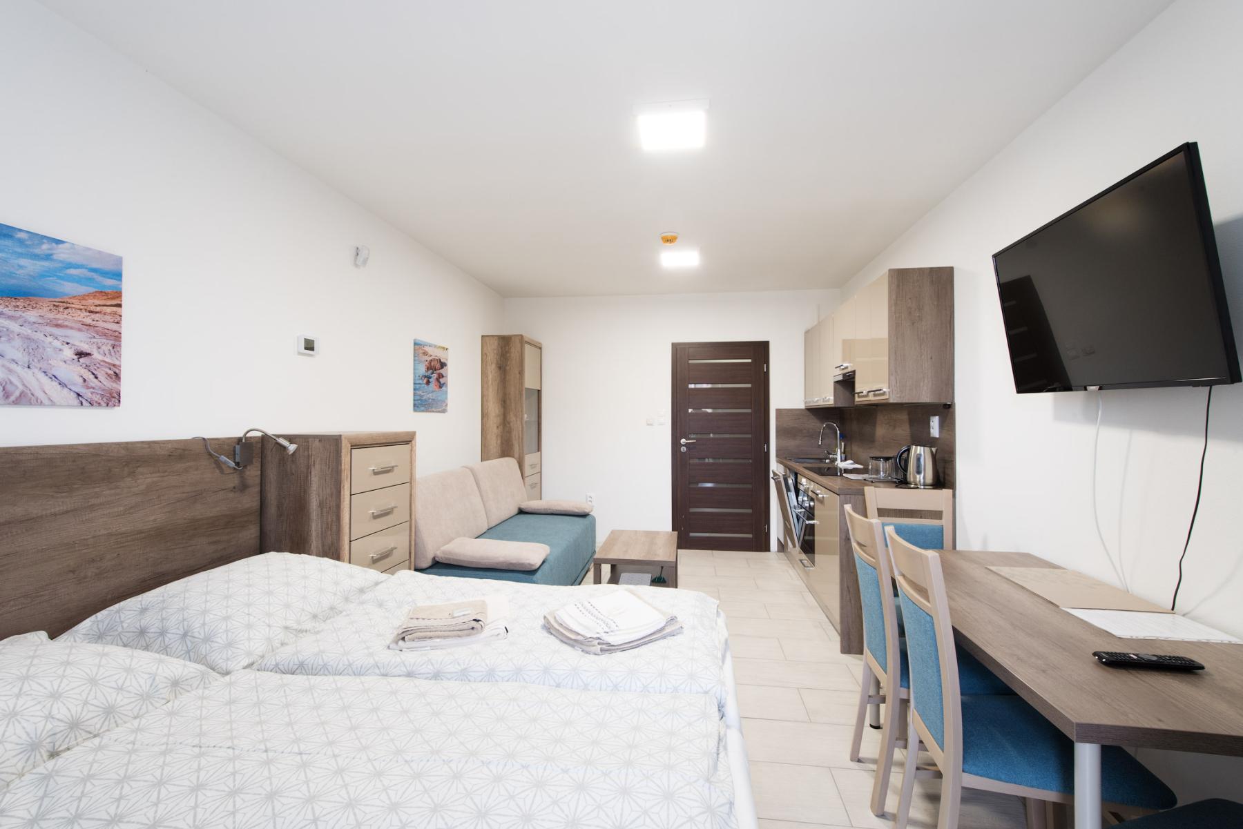72 €Štúdiový apartmán s rozkladacou pohovkou, ktorú možno použiť ako prístelku pre 1 dospelého alebo 2 deti. Nachádza sa v budove Diamond na prízemí a má vonkajšiu terasu prístupnú z apartmánu.